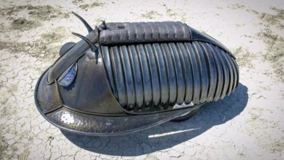 Electrobite схож по внешнему виду с вымершими морскими членистоногими – трилобитами. Авто построили с применением старинных способов кузнечного дела на базе современной архитектуры и электропривода. Металлический экзоскелет ручной работы получил эффектную подсветку.