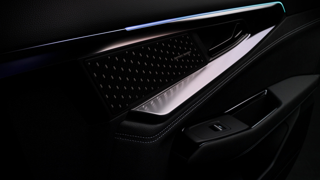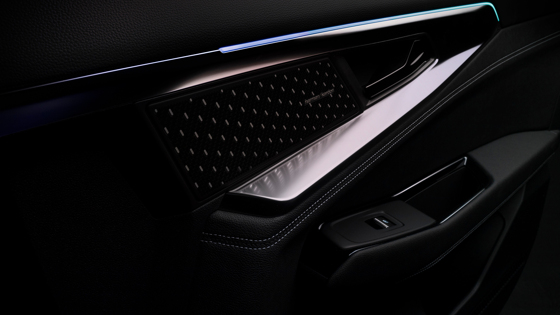 Уровни передней панели разделяет световая полоса, которая продолжается на дверях. Они отделаны тем же мягким материалом, текстилем с градиентом от черного к светло-серому и синтетической кожей под названием synderm.