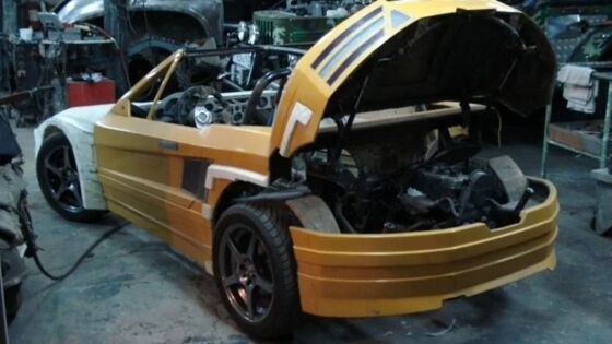 В основе лежит самодельная пространственная рама, сваренная из стальных труб круглого сечения. Сверху на него надет кузов, выклеенный из стеклоткани.