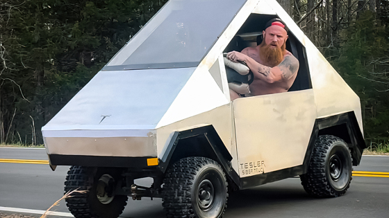 Джинджер Билли построил копию электропикапа из деревянного угловатого каркаса, который обшил металлическими панелями. Внутри он установил планшет вместо мультимедийной системы, а место приборной панели заняла распечатанная фотография. Судя по ролику, по пересеченной местности машина мчится, как настоящий внедорожник.