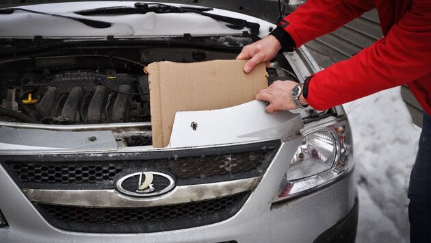 Некоторые владельцы автомобилей, как только наступит холодное время года, начинают закрывать радиаторную решетку автомобилей при помощи картонки.