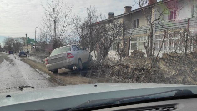Lada Priora вылетела с проезжей части на обочину. Судя по фотографиям, у машины серьёзно повреждён бампер. Автомобиль врезался в один из придорожных сугробов, которые сейчас представляют собой плотно слежавшуюся массу снега и льда.