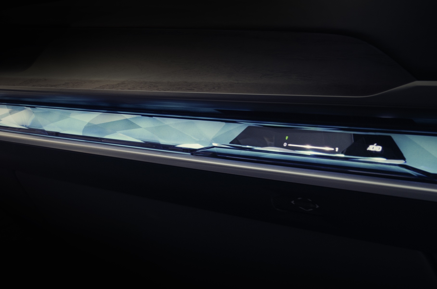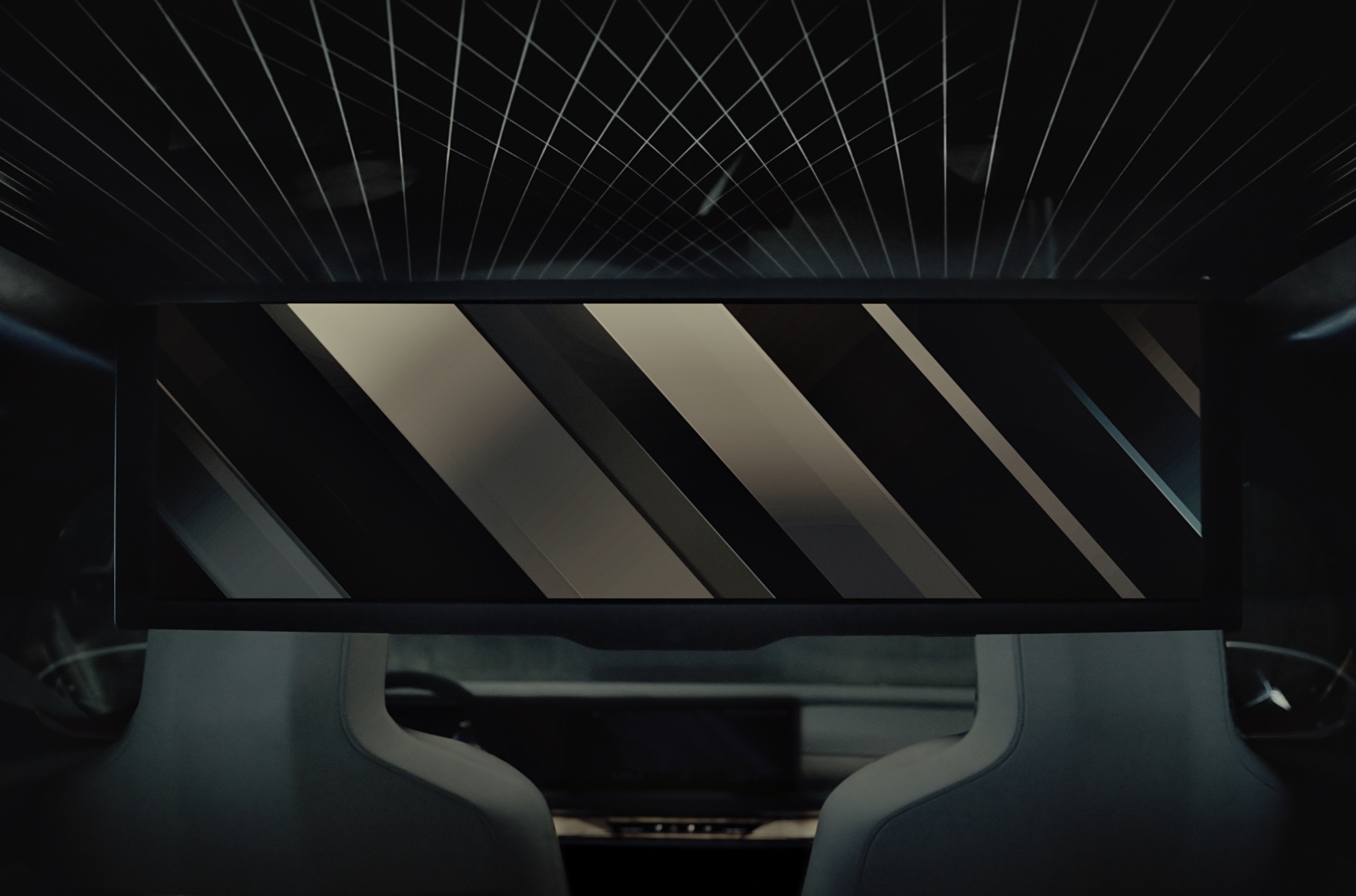 В потолке перед задними сиденьями приютился широкоформатный 31-дюймовый экран BMW Theatre Screen с интегрированной аудиосистемой Bowers & Wilkins Diamond Surround Sound. Соотношение его сторон — 32:9. Разрешение — 8K (8000×2000 пикселей). Дисплей фактически превращает автомобиль в мобильный кинотеатр и открывает доступ к различным стриминговым сервисам.