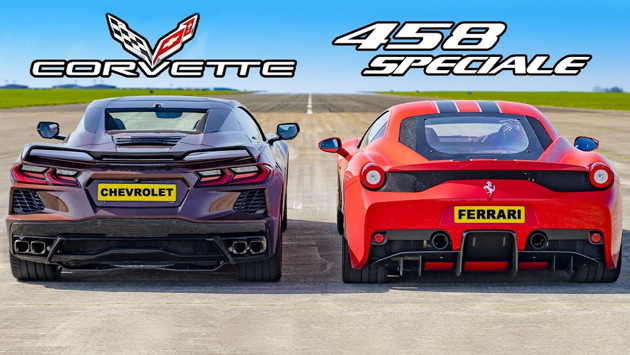 Британский YouTube-канал carwow устроил дрэг-гонку между новым Chevrolet Corvette C8 и коллекционным суперкаром Ferrari 458 Speciale. Среднемоторные заднеприводные купе с «атмосферниками» V8 померились силами в соревнованиях с места на четверть мили, параллельных стартах с хода с 50 миль в час (80 километров в час) на полмили, а финальным тестом была оценка эффективности тормозных механизмов со скорости 100 миль в час (161 километр в час).