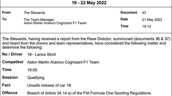 Рассмотрев обстоятельства инцидента, произошедшего в первой части квалификации, когда в Aston Martin выпустили Лэнса Стролла на пит-лейн прямо перед проезжавшей машиной Ландо Норриса, стюарды признали вину команды в создании опасной ситуации. На команду наложен денежный штраф в 5000 евро.