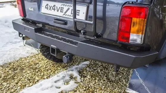 Усиленный бампер не только отвечает за повышение прочности, но и делает транспортное средство более функциональным и проходимым. У такого бампера есть вырезы под реечный домкрат. Они сконструированы таким образом, чтобы упрощать процесс установки в любых дорожных условиях.