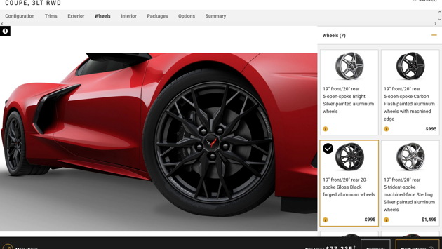 Компания Chevrolet выпустила тщательно обновленный онлайн-конфигуратор Corvette Stingray 2023 года, который дает энтузиастам и покупателям возможность придумать свой идеальный «Ветт». Когда вы откроете конфигуратор, вам будет предложен выбор между купе и кабриолетом. После того, как вы выбрали идеальный вариант кузова, Chevrolet предлагает на выбор пакеты отделки салона 1LT, 2LT и 3LT. Мы выбрали купе в комплекте с пакетом 3LT. Цвета — это следующая область Vette, которая может выделить его. Доступные цвета для модели 2023 года включают Arctic White, Black, Torch Red, Ceramic Matrix Grey Metallic, Elkhart Lake Blue Metallic, Hypersonic Grey Metallic, Carbon Flash Metallic, White Pearl Metallic Tricoat, Silver Flare Metallic, Caffeine Metallic, Accelerate Yellow Metallic, Rapid. Синий, Amplify Orange Tintcoat и Red Mist Metallic Tintcoat. Доступны семь вариантов колес, все из которых 19-дюймовые спереди и 20-дюймовые сзади. Мы выбрали самые дорогие колеса, кованые алюминиевые диски с механической обработкой. Также доступно множество внутренних настроек. Выберите керамический белый интерьер с красной строчкой, и конфигуратор обновит вас до 70th Anniversary Special Edition. Тогда есть доступные пакеты для Corvette. Те, кто хочет сделать особенно смелое заявление, также могут выбрать пакет Stingray R Performance за 695 долларов. Также предлагаются различные элементы внешней отделки, в том числе популярный спойлер High Wing, видимые панели крыши из углеродного волокна, красная крышка двигателя и множество различных автомобильных чехлов. Читайте также о том, что Chevrolet Corvette Z06 2023 года демонстрирует свою хитрость Aero Engineering.