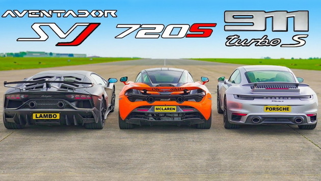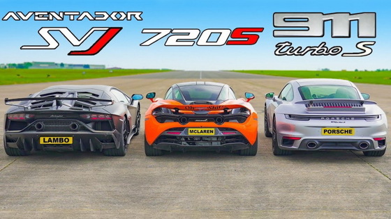 YouTube-канал carwow устроил дрэг-гонку между суперкарами Lamborghini Aventador SVJ, McLaren 720S и Porsche 911 Turbo S (992). Дуэль между двухдверками с двенадцатью, восемью и шестью цилиндрами включала в себя старты с места на четверть мили, параллельные гонки с хода с 50 миль в час (80 километров в час) на полмили; финальным испытанием была оценка эффективности тормозных механизмов со 100 миль в час (161 километр в час).