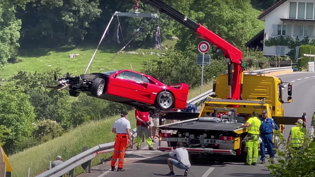 По информации швейцарского издания 20 Minuten, ни водитель, ни стоявшие в месте аварии зрители не пострадали, а вот о редком купе такого не скажешь. Сам момент ДТП не попал в объектив камер, но вот эвакуацию поврежденного суперкара сняли — судя по видео, передняя часть F40 сильно разбита, а также пострадали и задняя часть купе.