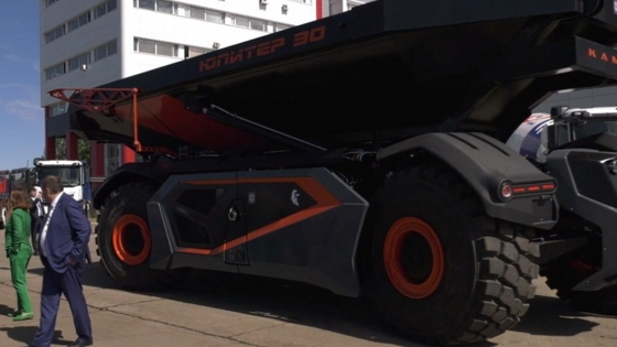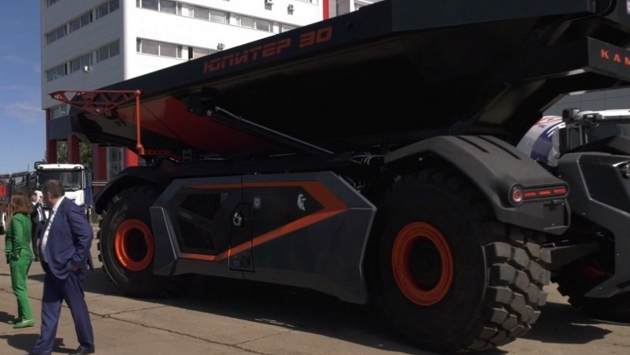 КамАЗ показал прототип 50-тонного самосвала «Юпитер-30», у которого нет кабины водителя. Это 8,8-метровый полноприводный карьерный самосвал с электромеханической трансмиссией, 450-сильным двигателем, кузовом объёмом 25 кубометров и грузоподъёмностью 27 тонн.