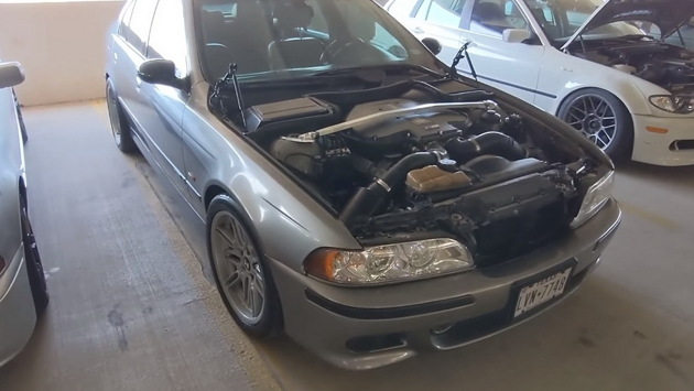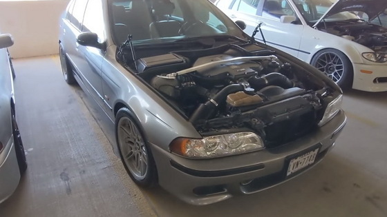 Видео снято на паркинге при неудачном освещении, а детально автомобиль не показан, но на первый взгляд кажется, что BMW M5 E39 находится в хорошей форме, несмотря на солидный пробег. Неплохо сохранились и кузов, и салон, а единственный нюанс — демонтированный капот. Деталь сняли специально, вероятно, для лучшего доступа к агрегатам.