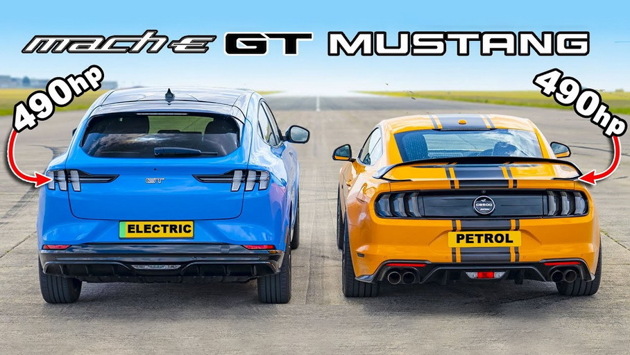 YouTube-канал carwow устроил дрэг-гонку между Ford Mustang GT с V8 и электрокаром Ford Mustang Mach-E. В дуэли поучаствовало доработанное купе, поэтому мощность «Мустангов» на бензине и электротяге одинакова. Победителя выявили по итогам стартов с места на четверть мили, параллельных гонок с хода с 30 миль в час (48 км/ч) на полмили; финальным испытанием была оценка эффективности тормозов со 100 миль в час (161 км/ч).