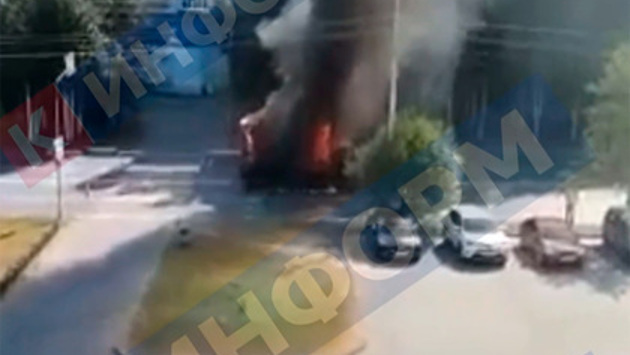На записи видно, как в уже полыхающем автомобиле происходит взрыв. На последующих кадрах запечатлено тушение горящей машины пожарными. Судя по видео, кузов и кабина автомобиля практически полностью выгорели.