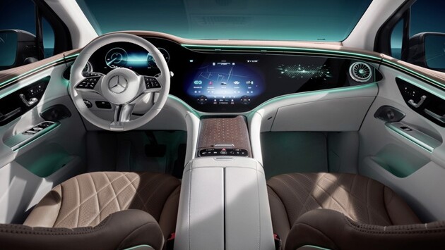 В целом салон почти такой же, как у седана EQE. Судя по опубликованным снимкам, перед водителем и передним пассажиром располагается уже знакомая поклонникам моделей немецкого бренда большая стеклянная панель MBUX Hyperscreen, которая объединяет в себе три больших экрана. Речь идёт о виртуальной «приборке», тачскрине информационно-развлекательной системы и дополнительном экране для переднего пассажира. Ширина такого дисплея составляет 141 см. Ещё у нового кроссовера дефлекторы вентиляции выполнены в виде в виде турбин.