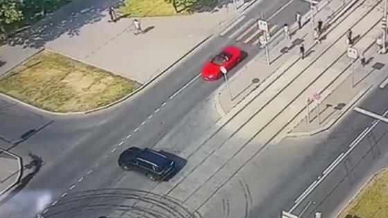 На кадрах видно, как Lexus поворачивает на шоссе налево, и в автомобиль врезается следовавшая в сторону области ярко-красная Ferrari. От удара спорткар вылетает в сторону тротуара, но на саму пешеходную зону не попадает.
