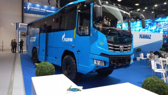 На Газовом форуме-2022 КамАЗ представил новую модель полноприводного автобуса-вездехода. Транспортное средство разработано специально для нефтяников. Машина доставляет работников к месторождениям нефти и газа. Автобус комплектуется как бензиновым, так и дизельными двигателями, также есть газовые варианты, работающие на сжиженном или природном газе. Дополнительные газовые баллоны позволят увеличить запас хода до 550 километров на одной заправке.