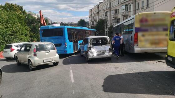 Известно, что водитель автобуса Hyundai, двигаясь со стороны Светланской в направлении Спортивной, совершил столкновение с движущимися в попутном направлении транспортными средствами: Honda Freed и Honda HR-V. В свою очередь Honda Freed столкнулся с автомашиной Honda Vezel, а Honda HR-V – с Toyota Corolla Axio. Далее Honda Vezel врезался в автобус ЛиАЗ.