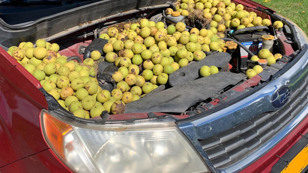 Комичный случай: белка каким-то образом спрятала 558 грецких орехов под капотом Subaru Forester