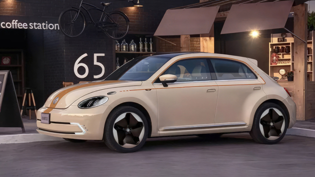Volkswagen Beetle 2024 года по версии Георгия Тедорадзе выглядит вполне серийным продуктом: это пятидверный хэтчбек в бежевом кузове, как у Volkswagen Beetle Final Edition, с коричневыми полосами на капоте и дверях, с аэродинамическими дисками, небольшим спойлером на крыше и светодиодными С-образными элементами на переднем бампере. Такой электромобиль мог бы стать альтернативой существующему ID.3.