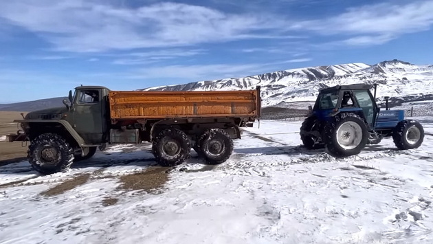 На YouTube-канале разместили любопытный ролик, в котором видавший виды отечественный грузовик Урал-5557 пытается перетянуть тросом зарубежный трактор New Holland 110-90. Судя по номерам и антуражу, действие происходит на заснеженном грунтовом склоне где-то в Азербайджане. Оба дуэлянта полноприводные с объёмными дизельными моторами и «зубастыми» шинами.