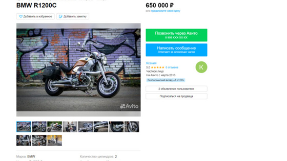 «Продается BMW R100 °C Independent. Грациозный, мощный, внешне довольно-таки необычный круизер. В отличном состоянии. Хороший басовитый выхлоп Staintune. Стоимость мотоцикла — 650 000 рублей», — указано в объявлении на сайте Avito.