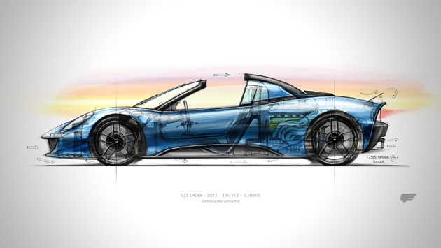 Компания Гордона Мюррея на следующей неделе представит родстер T.33 Spider, открытую версию одноименного купе. Машина получит двигатель Cosworth GMA V12, два варианта трансмиссии и минимально возможный набор электронных помощников — АБС и систему динамической стабилизации. Интересно, что T.33 изначально проектировался как спайдер, но авторы решили сначала выпустить купе.