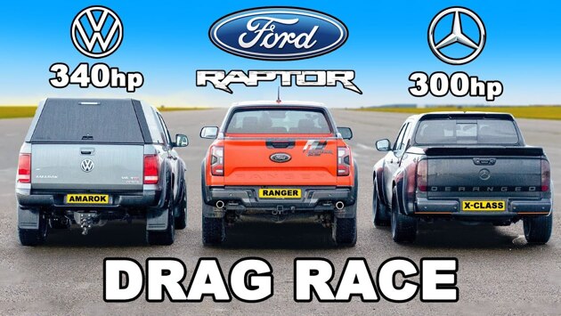 Авторы YouTube-канала Carwow так часто делают ролики с дрэг-рейсингом автомобилей, что удивлять аудиторию им становится всё сложнее. Но на сей раз авторы смогли сделать действительно необычную гонку, потому что в заезде на четверть мили они свели сразу три пикапа — в соперники новейшему Ford Ranger Raptor они взяли Volkswagen Amarok и Mercedes-Benz X-Class. Причём немецкие модели с тюнингом, а американская — стандартная.