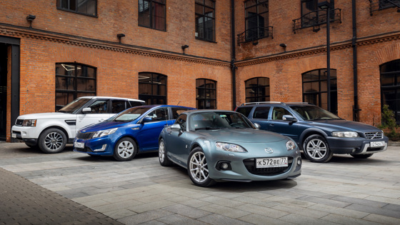 Автопарк для эксперимента следующий: хэтчбек Kia Rio 2014 года с одним фактическим владельцем и маленьким пробегом, родстер Mazda MX-5 2013 года с прозрачной историей на протяжении почти всего пробега, внедорожник Range Rover Sport 2013 года и универсал повышенной проходимости Volvo XC70 2006 года с богатой биографией — как минимум, в силу возраста.