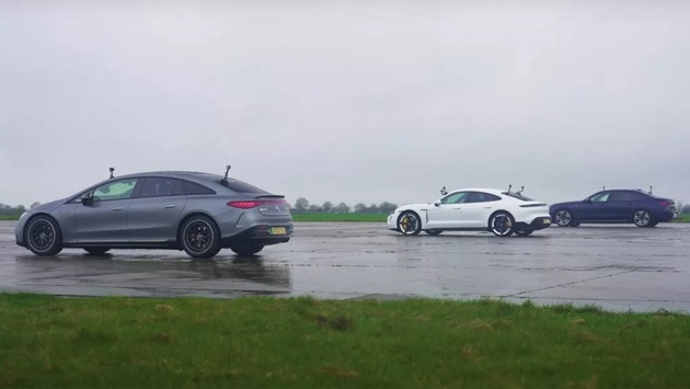 Когда Porsche выпустил Taycan Turbo S, это был самый быстрый электрический седан после Tesla Model S. Но прошло несколько лет с тех пор, как он появился на рынке. Конкуренты, включая Mercedes-Benz и BMW, также выпустили собственные быстрые и мощные электрические седаны. Чтобы выяснить, догнали ли Mercedes и BMW Porsche и Taycan Turbo S, портал CarWow собрал Mercedes-AMG EQS 53 и BMW i7 50 и начал соревноваться на них с Porsche. В технических документах Taycan Turbo S имеет преимущество. Два его электродвигателя вместе выдают 750 л.с. и крутящий момент 1050 Нм. Для сравнения, Mercedes-AMG EQS 53 выдает 1020 Нм крутящего момента. Затем у нас есть BMW, замыкающий с «всего» 544 л.с. и 745 Нм. Важно отметить, что BMW i7 50 — единственный, который вы можете приобрести в Великобритании прямо сейчас, и это не самая мощная доступная версия, поскольку это будет 650-сильный i7 M60. Учитывая значительный недостаток мощности, в котором находится BMW i7 50, неудивительно, что два других уносят его из воды. При этом Porsche и Mercedes-AMG более близки, чем можно было бы ожидать. Mercedes-AMG EQS 53 способен совершить прыжок с финиша в обоих дрэг-рейсингах. Но по мере того, как скорость начинает расти, Porsche приближается и обгоняет его, отчасти благодаря тому факту, что он весит примерно 300 кг меньше, чем у EQS. В конечном итоге он преодолел четверть мили за 11,4 секунды по сравнению с 11,5 секундами Mercedes и BMW со временем 12,7 секунды. Читайте также о том, что марка Alpine A110 хочет установить собственный рекорд на Пайкс-Пик и побить Porsche Cayman GT4 Clubsport.