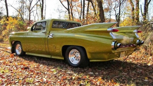 Самое интересное начинается сразу за кабиной: вместо обычного кузова тут появилось нечто, здорово напоминающее заднюю часть Cadillac 1959 года, с эффективными плавниками и выхлопными патрубками на месте стоп-сигналов.