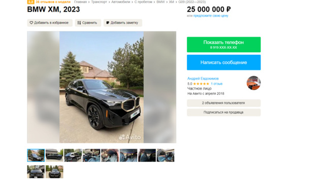 Курганец выставил на продажу премиальный суперкроссовер BMW XM за 25 млн рублей. Объявление о продаже размещено на сайте Avito.