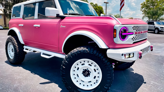 Помимо розовой отделки кузова и белого кожаного салона, Bronco оборудовали силовыми бамперами, накладками на порогах, а также 20-дюймовыми колесными дисками с грязевыми покрышками и расширителями арок. Кроме того, внедорожник получил дополнительные световые приборы в переднем бампере и головную оптику, меняющую цвет.