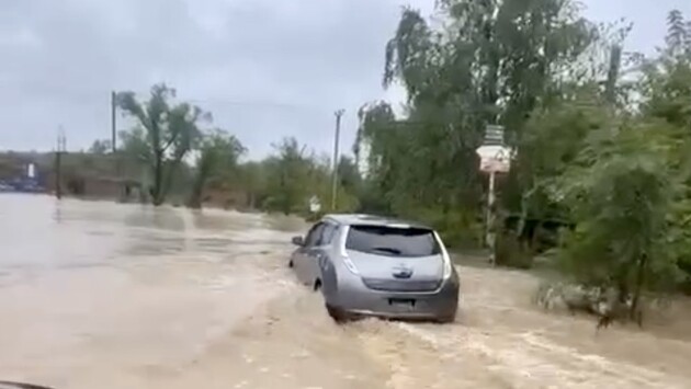 Два молодых человека попытались проехать по затопленной дороге, но, уйдя под воду на полколеса, решили остановиться. Место действия неизвестно, но так накануне выглядело почти все Приморье.