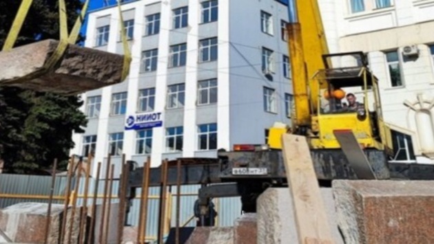 Демонтированные и тщательно промаркированные камни из гранита рабочие теперь устанавливают на обновленное основание монумента.