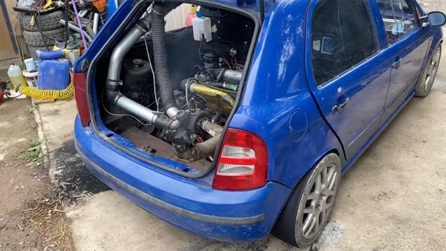 Для установки нового двигателя с коробкой передач был использован подрамник от Volkswagen Bora. Агрегаты заняли место заднего дивана, превратив Skoda Fabia не только в заднеприводный, но и среднемоторный хэтчбек.