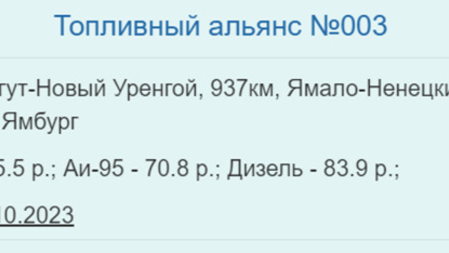 «На 6 октября литр бензина марки АИ-92 продается в Ямбурге на АЗС „Топ-Альянс“ за 65,5 рублей. Дешевле всего бензин этой марки можно купить в Салехарде и Надыме, там цена за литр составит 51,5 рубля», — сообщается на сайте Russiabase.ru.