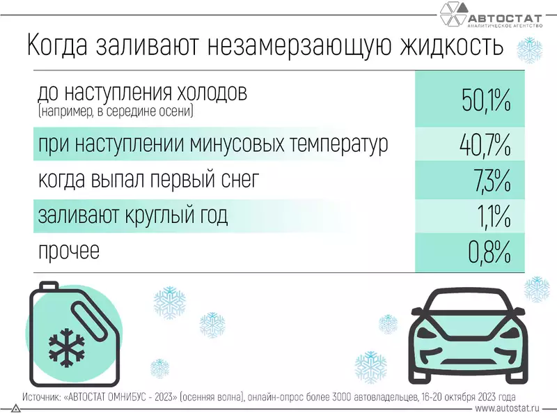 Опубликованы любопытные результаты «сезонного» опроса – в дополнение к нашим о сезонной смене шин и поднятии настроения. С 16 по 20 октября в опросе «Автостата» на тему «Когда заливают незамерзающую жидкость» приняли участие более 3 тысяч респондентов.
