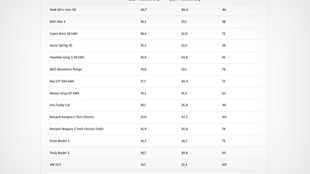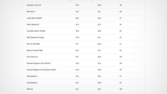 Наименьшая разница в энергопотреблении при температурах +23 и -7 градусов была отмечена у китайского BYD Atto 3, дешёвого Dacia Spring, Ora Funky Cat и Audi Q4 e-tron. У этих авто расход электроэнергии вырос на 38, 39 и 46 процентов соответственно. За эффективность, судя по всему, платят комфортной температурой в салоне, например, внутри лидера теста - Atto 3 - было прохладно (не более 16,6 градусов).