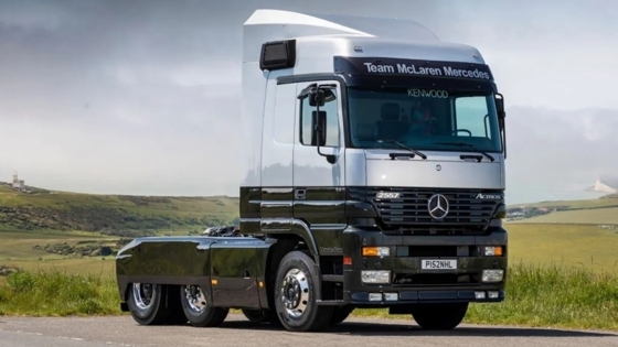 Этот экземпляр не просто MP1: он один из первых выпущенных Actros (речь идет о MP1 2557 1997 года) и один из четырех грузовиков, поставленных гоночной команде McLaren в рамках спонсорской программы с Mercedes-Benz.