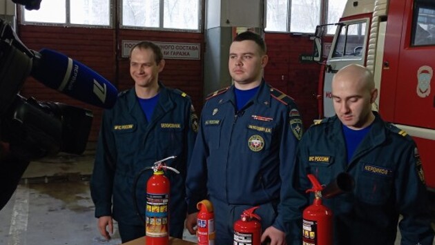 Сотрудники 38 пожарно-спасательной части рассказали репортеру Первого канала о пользовании огнетушителем
