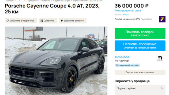 «Продается германский внедорожник Porsche Cayenne Coupe премиум сегмента. Имеет 659 лошадиных сил и разгоняется до 100 км/ч за 3,3 секунды и имеет карбоновую крышу, керамические тормоза и систему объемного звучания аудио», — сообщается в объявлении на сайте «Авито».