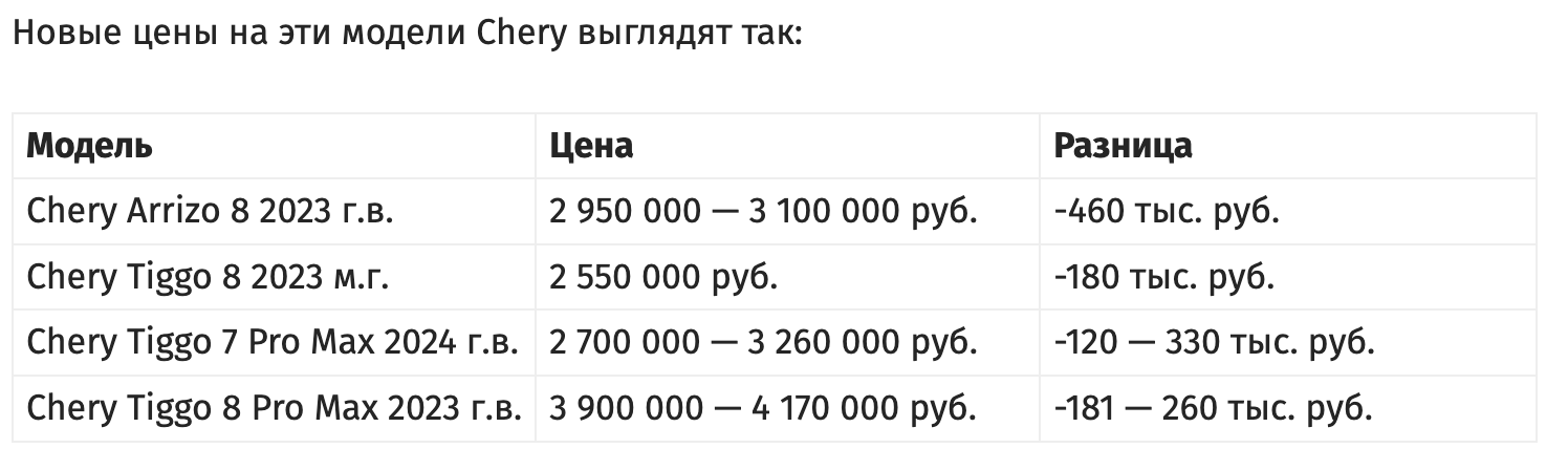 Компания Chery резко снизила цены на четыре свои модели в России. Седан Arrizo 8, рестайлинговый кроссовер Tiggo 8 Pro Max, а также паркетники Tiggo 8 и Tiggo 7 Pro Max в начале апреля разом подешевели на 120-460 тыс. рублей или 3,9-13,5%. Об этом «Автоновости дня» узнали в ходе регулярного мониторинга прайс-листов бренда.