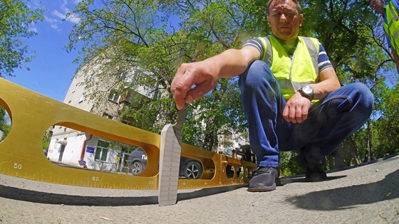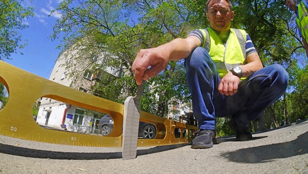 К радости водителей, манипуляции предстояли недолгие: нужно было определить глубину образовавшейся за два года колеи. На полосу выложили идеально прямую линейку и клинышком с разметкой проверили глубину выбитой колесами выемки. По нормативам допустим зазор в 2,5 сантиметра. В нашем случае с обеих сторон дороги зафиксировали лишь три миллиметра.