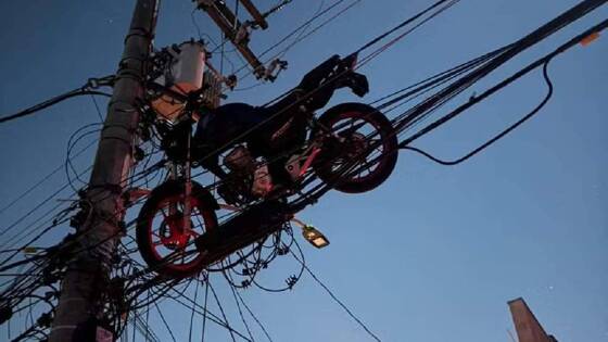 В Сети появилась фотография двухколёсного транспорта, который выглядит так, будто его специально повесили на провода, расположенные на высоте нескольких метров над землёй. Оказалось, что техника стала участником крайне странного и глупого происшествия с участием воздушного шара.