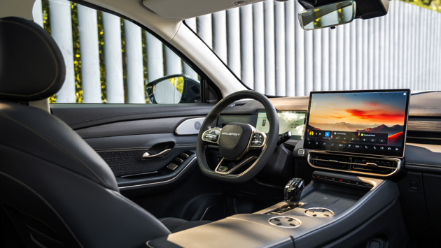 Спереди по центру установлен 15,6-дюймовый монитор медисистемы, работающей на чипе Qualcomm Snapdragon 8155. Система «дружит» с Apple CarPlay и Android Auto. Есть USB-разъемы и отсек для беспроводной зарядки. Диагональ приборной панели — 10,25 дюйма.