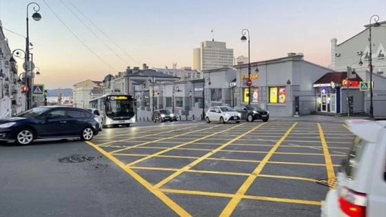 В столице Приморья на перекрестке Океанского проспекта и Семеновской возле остановки «Изумруд» вернули разметку-вафельницу. На этот раз городские службы нанесли ее иначе. Теперь линии нарисованы сплошняком, без пропуска для диагонального перехода.