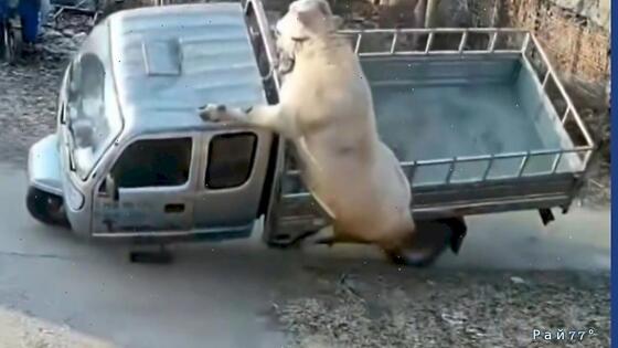 Рогатый обитатель китайской фермы продемонстрировал свой буйный нрав и, находясь в кузове мотороллера, опрокинул транспортное средство своего хозяина.