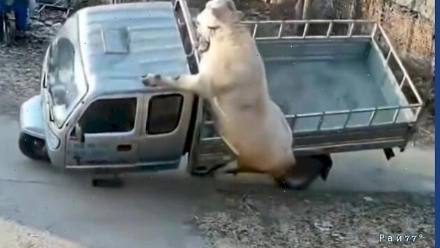 Китайский фермер столкнулся с проблемой, когда попытался переместить парнокопытного зверя. Видеокамера, установленная над сельской автомагистралью, запечатлела, как бык при попытке совершить побег, опрокинул на бок транспортное средство.