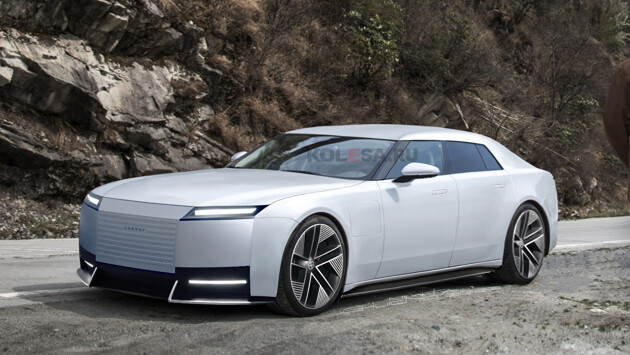 Передняя часть во многом будет схожа с концептом, разве что блоки фар станут более крупными. Сохранится огромная колёсная база с длинным капотом, позволяющая разместить за передними колёсами весьма немаленькие лючки для подзарядки, относительно простой дизайн боковин, «скрытые» передние стойки, как у родственных моделей Range Rover. У последних, судя по всему, будут позаимствованы выдвижные дверные ручки. Боковое остекление очень узкое, а дверные окна сделаны безрамочными. Пока наиболее скрытой является задняя часть, здесь лишь частично проглядываются элементы задней светотехники: можно ожидать появление горизонтальных светодиодных полосок во всю ширину кормы. Мы изобразили вариант как с обычным задним стеклом, так и с глухой заглушкой подобно концепту (на прототипах этот элемент пока под толстым слоем маскировки).