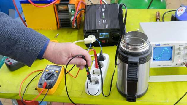 Эксперты «За рулем» испытали 8 преобразователей напряжения для автоКогда сетевое напряжение недоступно, то для того, чтобы запитать в машине ноутбук либо электроинструмент, рассчитанный на 220 В, вам понадобится преобразователь, или инвертор (от лат. inverto – «переворачиваю, изменяю»), – устройство для преобразования постоянного тока в переменный нужного напряжения. Такое преобразование необходимо во многих ситуациях: подключить при загородном строительстве болгарку, подзарядить аккумуляторы электроинструмента... – вариантов много. Кроме того, у всех современных инверторов на корпусе есть одно или несколько гнезд USB типа A для подзарядки низковольтных потребителей электричества. А мощности хватит? Ключевой момент: какая бы мощность ни была указана производителями инвертора, забирать он ее будет от аккумуляторной батареи вашей машины! Если, к примеру, кому-то вздумается подключить к нему микроволновку или мощный пылесос, то при нагрузке около 2 кВт батарее потребуется отдавать ток примерно в 150 А. В таком режиме она разрядится у вас на глазах за несколько минут. Придется постоянно гонять мотор машины, но и генератор не всесилен (особенно на машинах прошлых лет). Именно поэтому мы проверяли инверторы при работе от хорошо заряженной АКБ с подсоединенным к ней постоянно работающим пуско-зарядным устройством. Все устройства имели подключение к батарее напрямую, через «крокодилы»: никакое гнездо прикуривателя такие токи не выдержит – даже не пытайтесь. Как испытывали инверторы Всем устройствам предложили одну и ту же задачу: вскипятить воду с помощью бытового кипятильника мощностью 1 кВт. Это позволяет оценить ту реальную мощность, которые способны выдать инверторы в одинаковых условиях эксплуатации. Масса (1,25 кг) и начальная температура воды (15 °C) не меняются, остается оценить время работы. Как известно, величина энергии, необходимой для подобной работы, рассчитывается по формуле W = С·М·(Ткон. – Тнач.), где С – теплоемкость воды, М – масса, а Т – температура в начале и конце работы. А поскольку энергия – это мощность, помноженная на время, реальную мощность, которую получает наш кипятильник от каждого инвертора, вычисляем по формуле: Р = С·М·(Ткон. – Тнач.)/t, где t – время, затраченное в каждом конкретном случае. С учетом того, что 1 кал = 4,19 Дж, получаем простую формулу: Р = 445/t. Не проще ли было просто измерить напряжение и ток на выходе инвертора, чтобы получить мощность, перемножив одно на другое? Проще, но… неправильно. Дело в том, что почти во всех устройствах выходной сигнал представляет собой не синусоиду, а пародию на нее – см. наши пояснения ниже. И даже в некоторых инструкциях указано, что привычные вольтметры в таких случаях начинают врать. Кроме того, в ходе испытаний мы заметили, что и ток, и напряжение несколько меняются. А вот время кипячения стандартного количества воды от всего этого не зависит. Помимо кипятильника, каждому устройству было предложено поработать с электрическими инструментами – болгаркой и электродрелью. Дрель должна была просверлить отверстие диаметром 14 мм в дубовом бруске толщиной 40 мм. Болгарку заставили резать высокопрочный (подвесочный) болт диаметром 12 мм. Модифицированная синусоида и квазисинусоида Оба термина, часто употребляемые в инструкциях, означают в нашем случае одно и то же: вместо «п